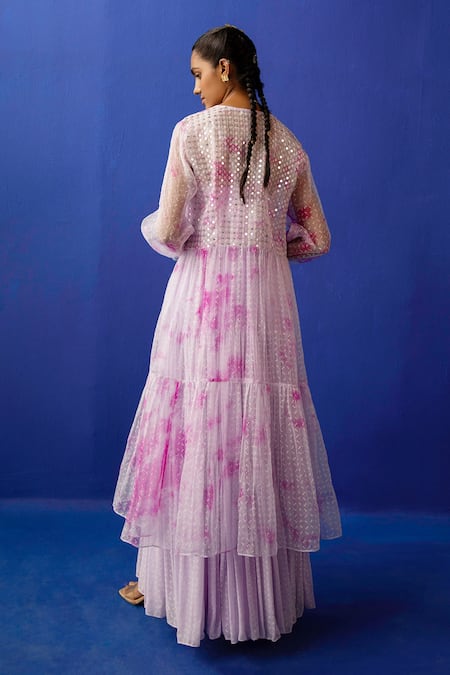 Lilac, fuschia tie & dye tunic with geometric print & embellished mirror work. Paired with tiered dress.