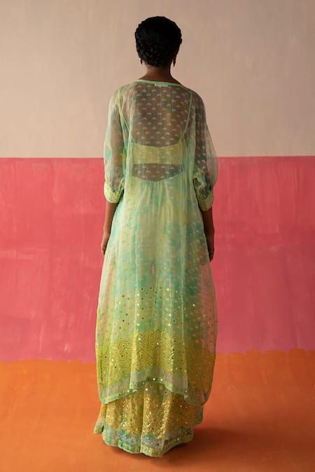 Green, yellow cape with geometric print & embellished sequin, mirror work. Paired with blouse & tie-dye sharara.