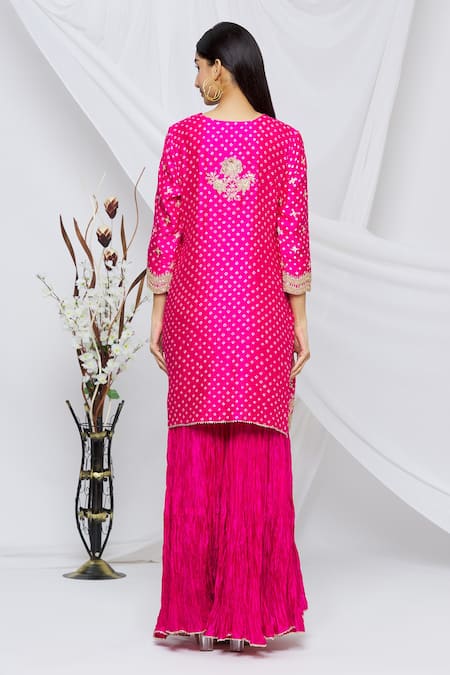 Pink kurta with bandhani print pattern & floral embroidered motifs. Paired with crushed sharara & dupatta.
