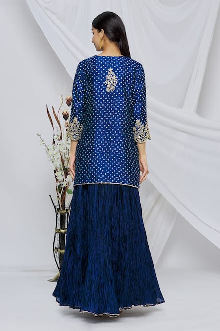 Blue kurta with bandhani print pattern & floral embroidered motifs. Paired with crushed skirt & leheriya dupatta.