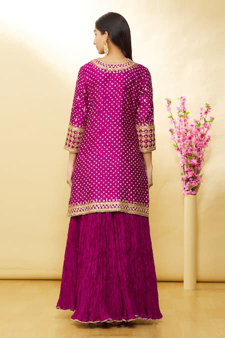 Magenta three quarter sleeve bandhej pattern kurta with gota patti flower embellishments. Paired with crushed lehenga and shaded dupatta.