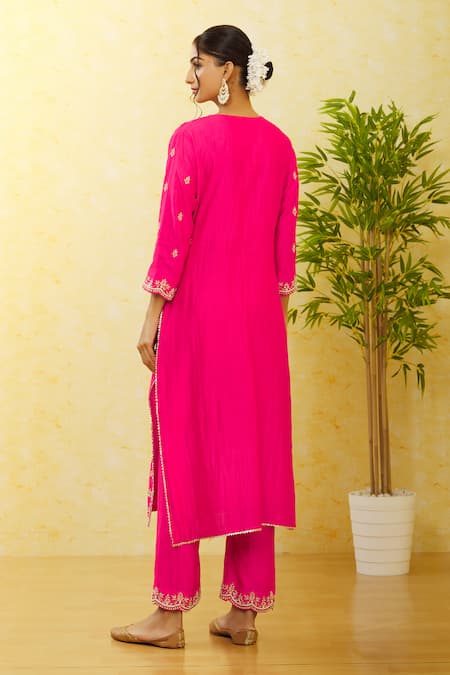 Strawberry red kurta featuring floral and beaded hand embroidery with a notched neckline and three-quarter sleeves. Paired with a matching pant and a pure organza shaded dupatta with scalloped detailing.