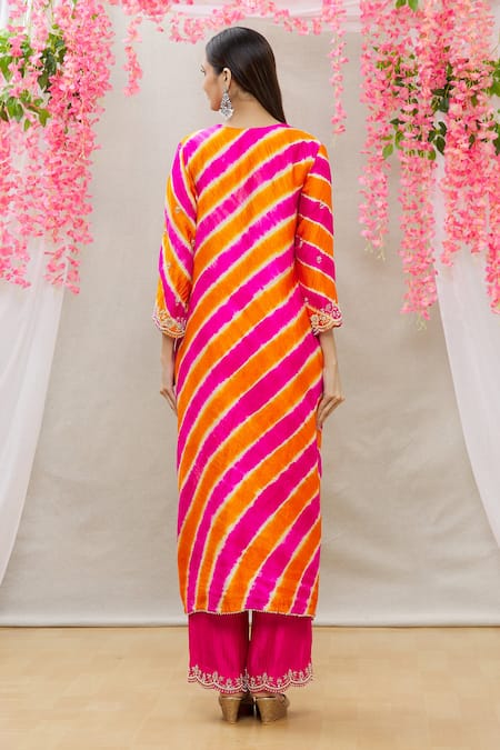 Orange & pink pure spun silk leheriya kurta with intricated hand embroidery. Comes with matching pure spun silk pant & pure organza scalloped leheriya dupatta.
