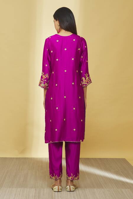 Magenta Pure Spun Silk Hand Embroidered Dori Notched Floral Kurta Pant Set