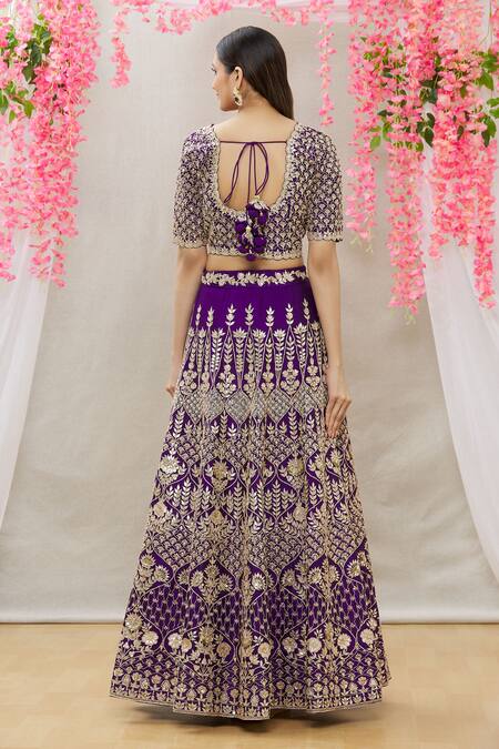 Purple Organza, Spun Silk Floral Motifs Embroidered Bridal Lehenga Set