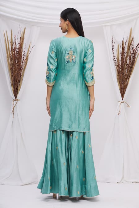 Blue Spun Silk Floral Motifs Notched Embroidered Kurta Sharara Set