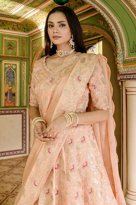 Peach lehenga featuring all over marori floral embroidery and gota embellishments. Paired with a matching padded blouse and dupatta made from pure satin organza.
