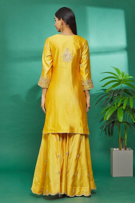 Yellow Dupatta Organza, Kurta And Sharara Pure Spun Silk Hand Embroidered Set