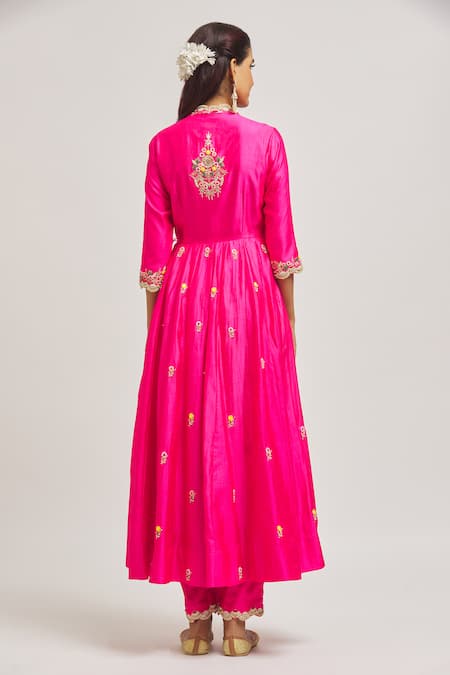 Pink Silk, Organza Pearls, Embroidery V-neck Hand Angrakha Pant Set