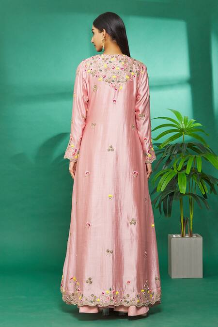Rose gold jacket with floral hand embroidery. Paired with embroidered lehenga and bustier.