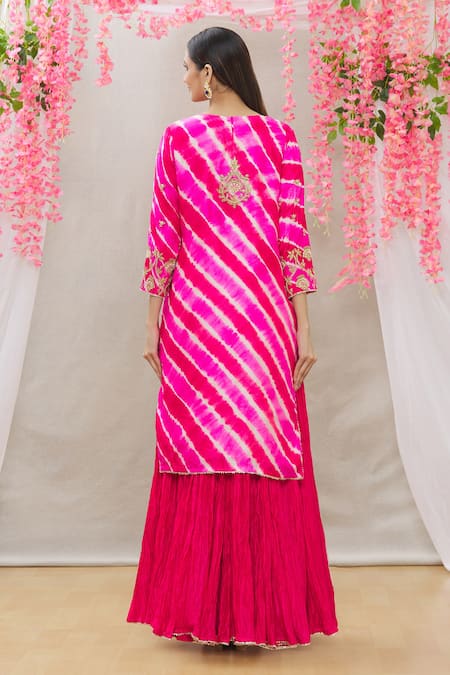 Rani hot pink pure spun silk leheriya kurta with intricated hand embroidery. Comes with matching pure cora silk crush skirt-lehenga and pure organza scalloped dupatta.