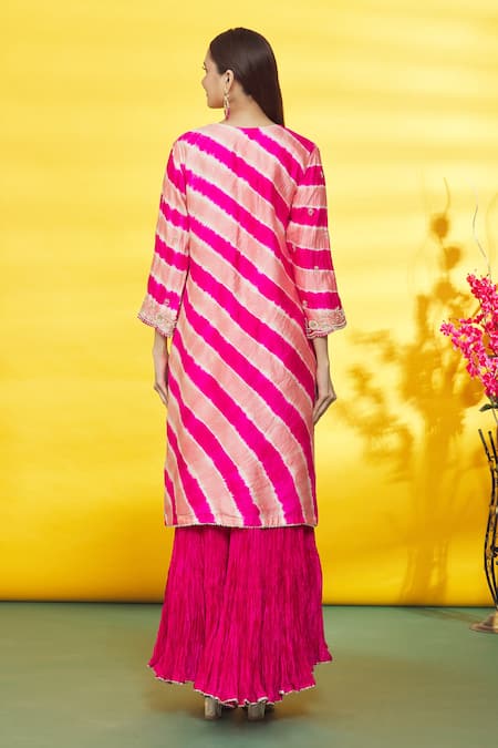 Hot pink kurta featuring leheriya pattern with scalloped neckline and embroidered details. Paired with a crushed sharara and pure organza dupatta.
