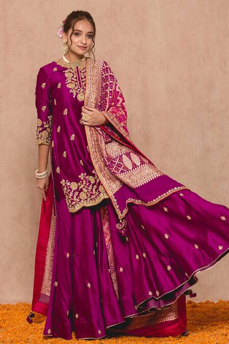 Magenta kurta with floral embroidered motifs and scalloped hem. Comes with sharara and bandhani print dupatta.