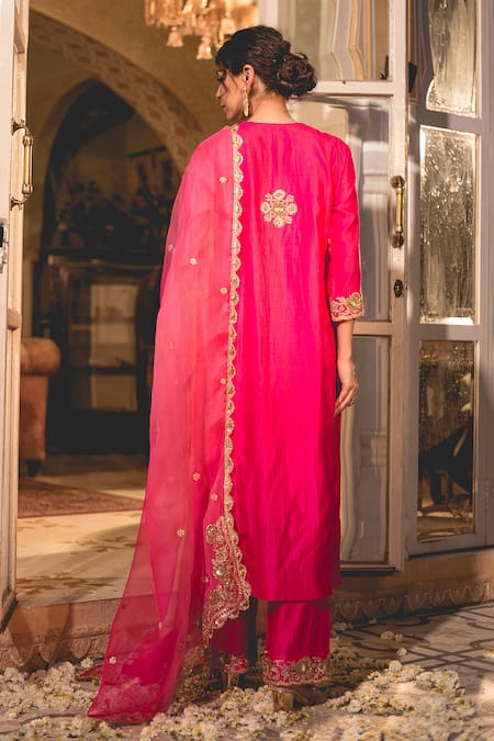 Hot pink kurta featuring zardozi and marodi embroidery in a floral pattern. Paired with a border embroidered pant and scallop bordered dupatta.