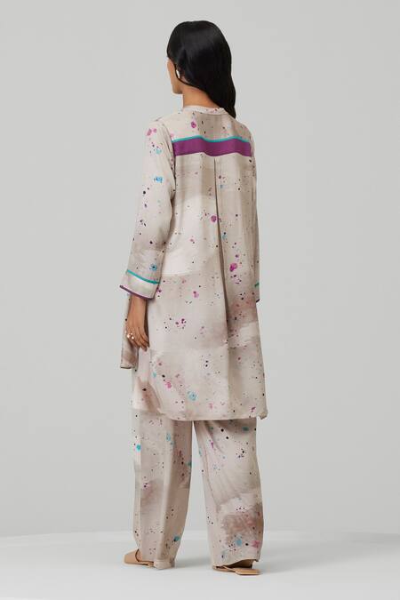 White, lilac and blue kurta with splash print and a high low hem. Paired with a pant.