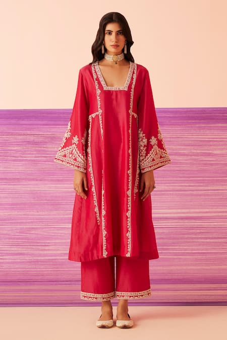 Magenta silk chanderi kurta featuring a blunt V neck and bell sleeves. Paired with a palazzo and an organza dupatta with scalloped cut work hem and embroidered borders.