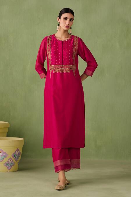 Magenta silk chanderi kurta featuring Mughal jaal embroidery with antique thread, beads, and sitara work. Paired with a scalloped organza hem palazzo and an organza dupatta.