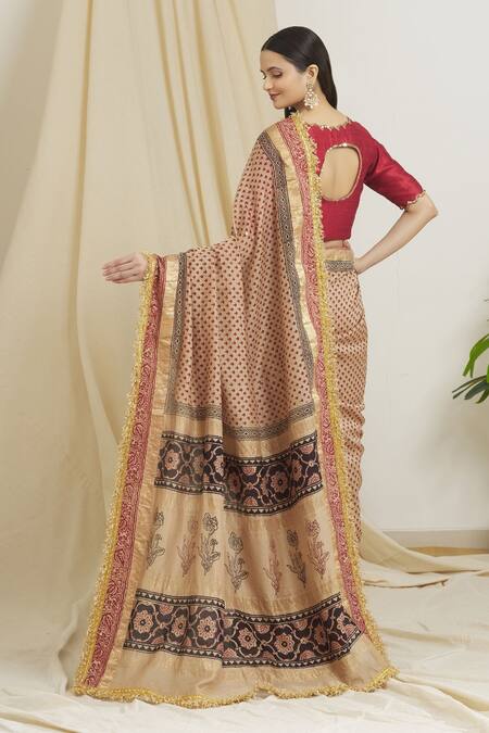 Beige hand block printed saree with gold lace detailing. Paired with maroon hand embroidered blouse and on front, back neck, sleeves .