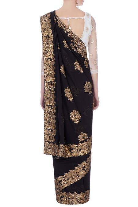 Black saree with all-over floral motif sequin work. Comes with contrast embellished contrast blouse.