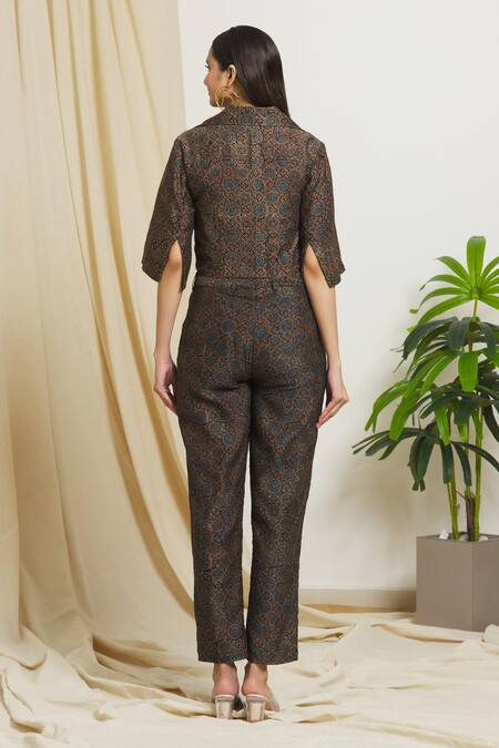 Black Chanderi Floral Mandala Lapel Collar Print Jacket Pant Set