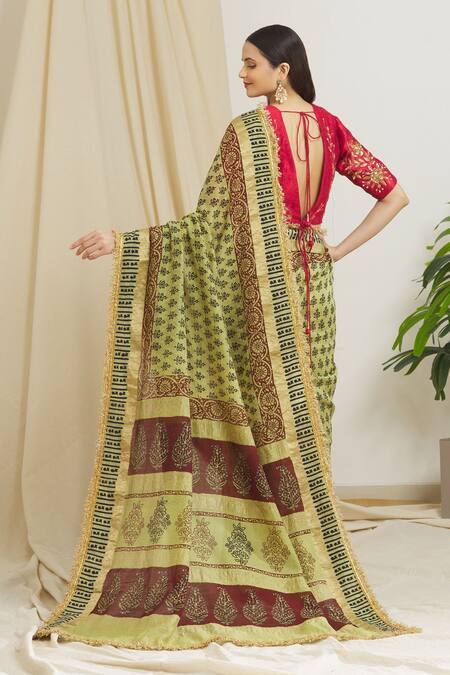 Lime green hand block print saree with gold lace detailing. Paired with maroon hand embroidered blouse.