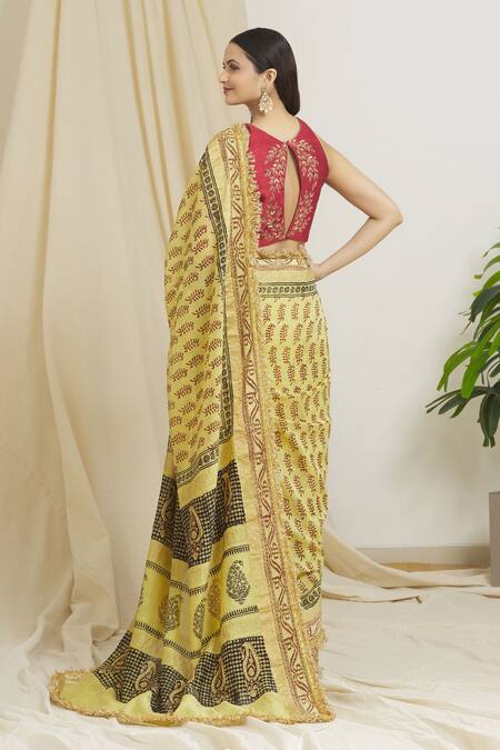 Lime green hand block print saree with gold lace detailing. Paired with maroon hand embroidered blouse.