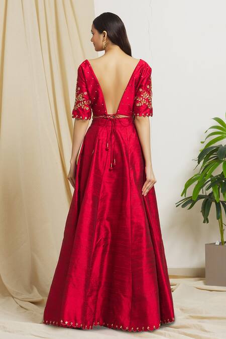 Red Raw Silk, Organza Floral, And Flower Embellished Blouse And Lehenga Set