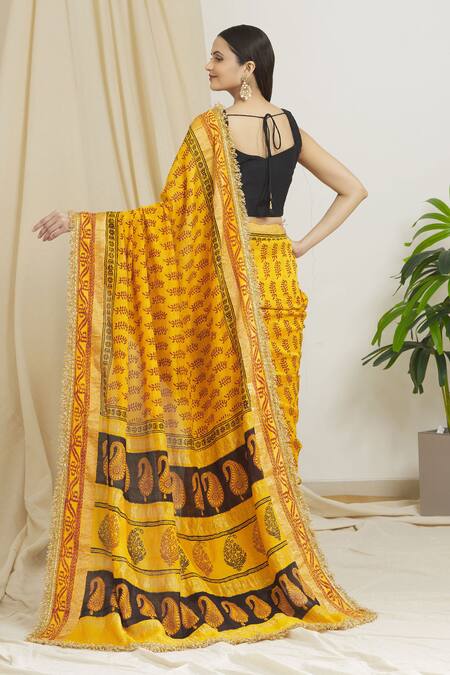Orange block printed saree with gold lace detailing. Paired with black hand embroidered blouse on front bodice.
