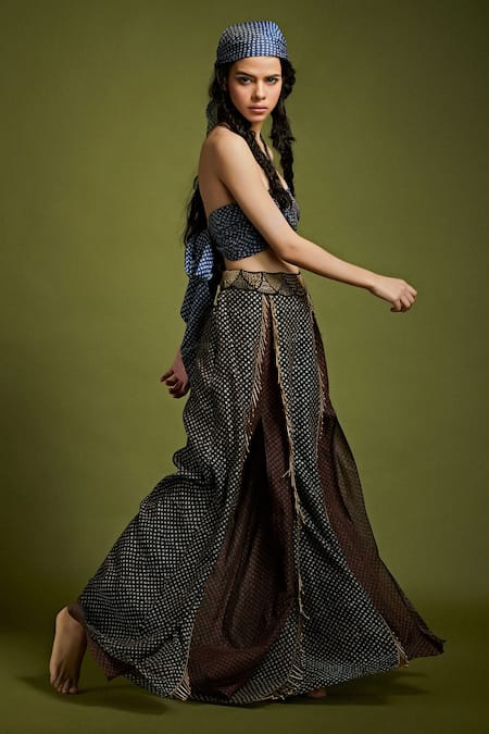 Maroon and black bandhani print layered pant with embroidered waist and slits.