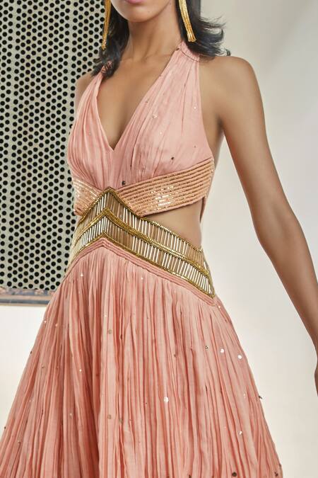 Pink maxi dress featuring badla embroidery, side cut-outs, and pleated A-line flare