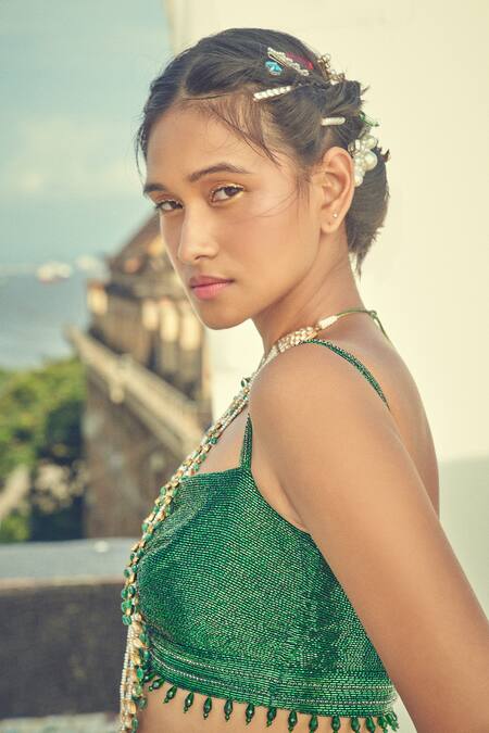 Emerald green crop top featuring a sweetheart neckline and cutdana embroidery