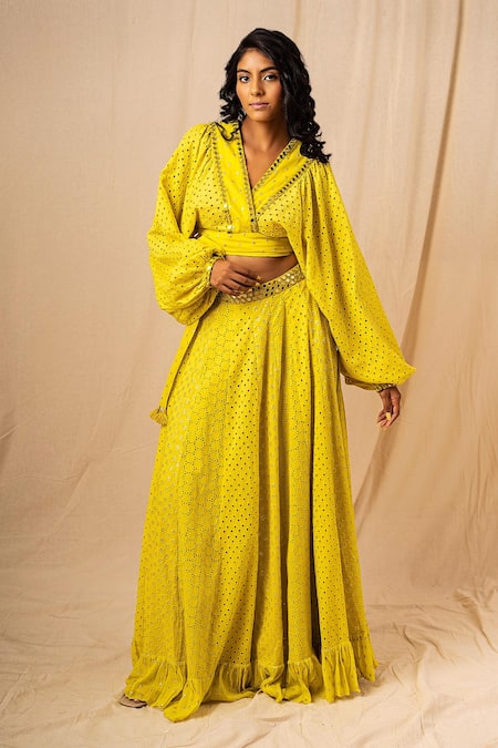 Yellow wrap crop top with puff sleeves, mirror work, embroidered panels & cutwork pattern.