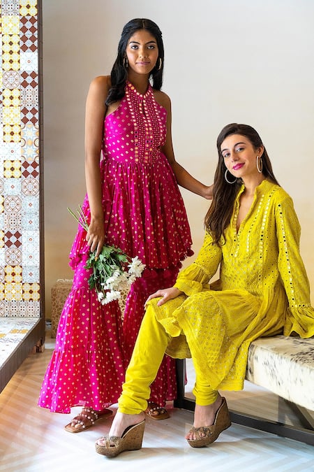 Yellow tiered & cutwork kurta with bell sleeves & mirror, floral embroidery.