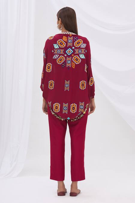 Maroon cape-style jacket with all-over resham embroidery, mirror -shell hand work & aztec motifs