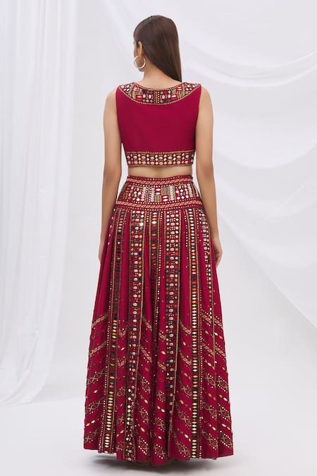 Maroon crop top with placement mirror embellishments, coin shell hand work & checkered pattern.