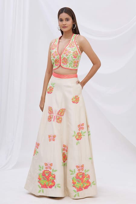 Ivory panelled lehenga with all-over multi-color floral-butterfly motif resham-sequin work.