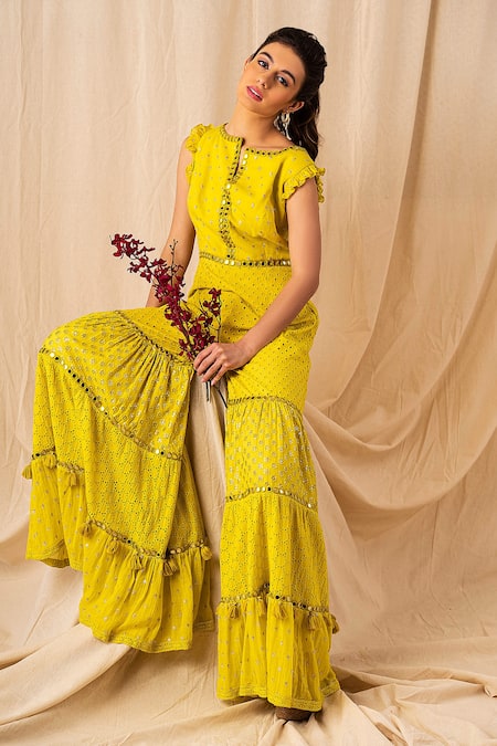 Yellow jumpsuit with ruffle sleeves, mirror work & cutwork pattern.