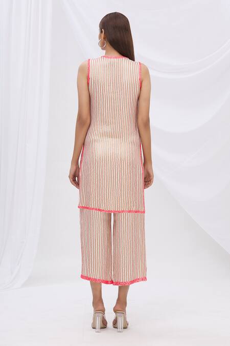 Ivory & pink straight short kurta all-over sequin work in striped pattern, mirror embellishments & tassel tie-up neck.