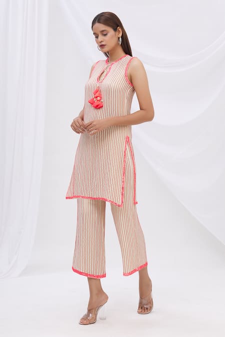 Ivory & pink straight pants with all-over sequin work in striped pattern & placement mirror embellishments.