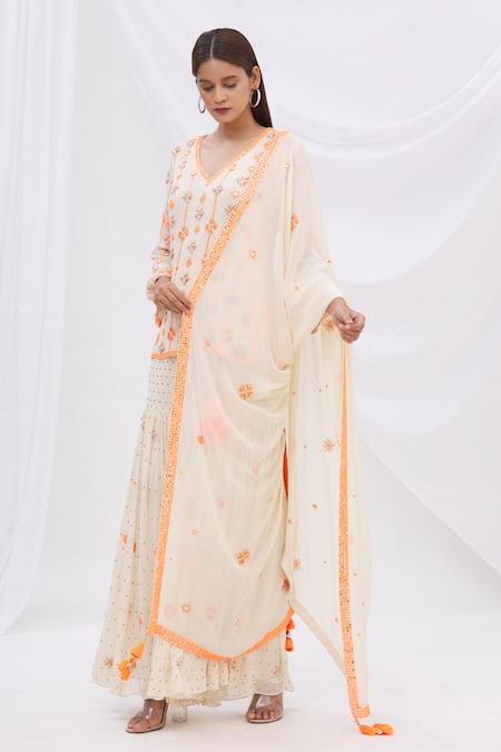 Ivory & orange dupatta with all-over resham-sequin, mirror worked motifs & tassel border.