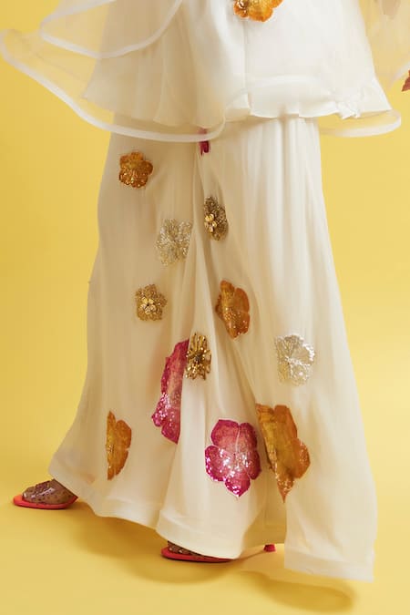 Ivory georgette flared sharara featuring an all-over varied floral pattern with multi-color sequin, cut dana, stone, and 3D floral applique hand embroidery