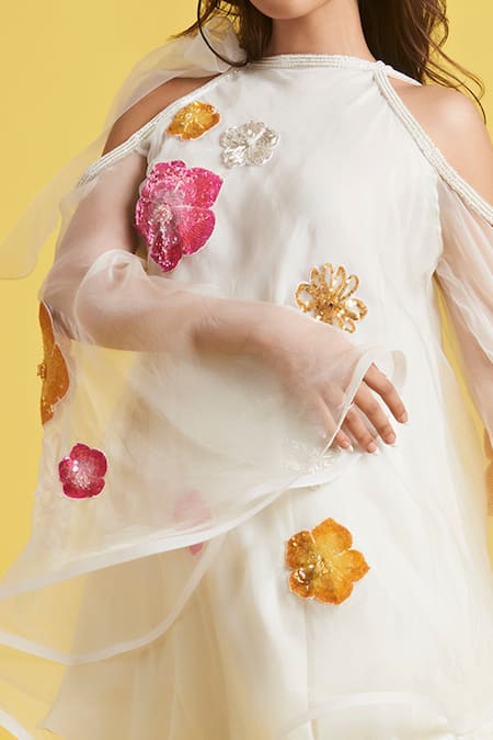 Ivory Organza Hand Embroidered Cut Dana Halter Neck Floral Peplum Top