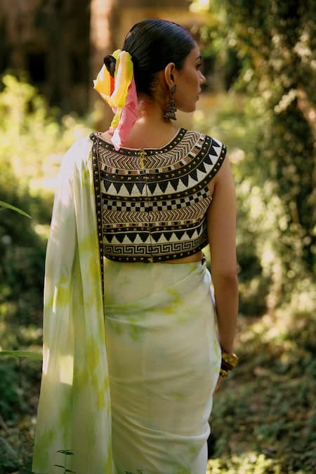 Intricate black embroidery on the blouse, Attached tassels on the saree