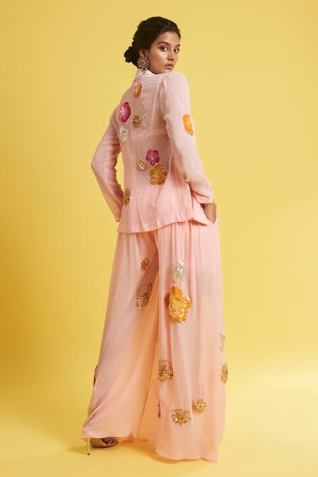 Pink gathered pant featuring scattered floral hand embroidered motifs with sequins