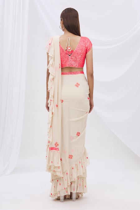 Ivory & pink pre-stitched tiered saree with ruffle border, floral motifs & resham-mirror embellishments.