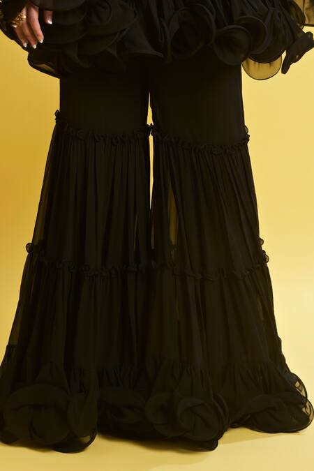 Black georgette flared pant featuring multi-layered tiered panels and ruffle borders