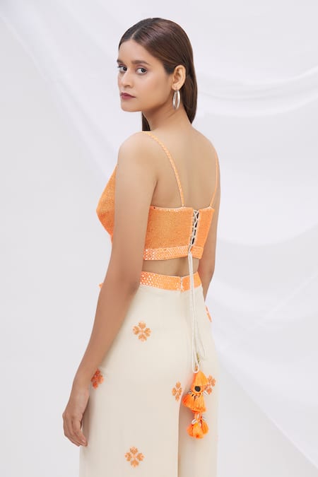 Orange & ivory crop top with tassel tie-up back, all-over thread embroidery, mirror embellishments & sheeted sequin work.
