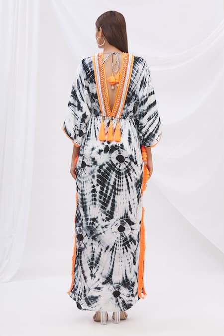 Black & white kaftan with all-over tie-dye, placement bead, stone-pearl hand work & orange multi-tassels.