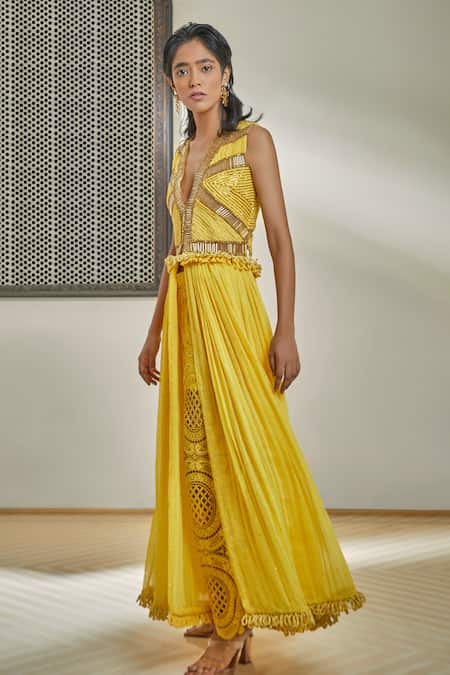 Yellow maxi dress crafted in chanderi fabric featuring a hand embroidered rope loop waistband and a front slit