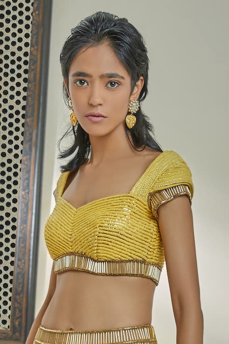 Yellow Chanderi Hand Embroidery Rope Sweetheart Neck Twisted Blouse